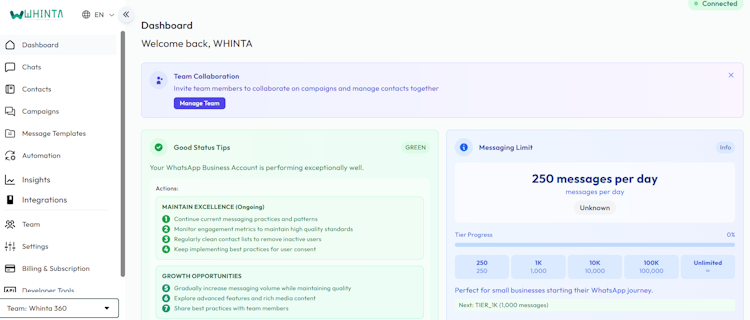 Whinta offers messaging automation and team collaboration features aligned with enterprise requirements. The broadcast campaign tool permits bulk messaging to multiple audience segments in a single operation. Automated replies provide configurable response templates for around-the-clock customer availability. A shared inbox consolidates conversations into a unified workspace while a chat ticket system tracks queries and streamlines resolution workflows. The flow builder enables the design of automated conversation paths and sequences for multi-step messaging campaigns. Real-time analytics deliver live performance metrics and customer behavior insights for ongoing engagement optimization. The team management module supports role assignment, permission controls, and task coordination across multiple users. Contact management capabilities allow systematic organization and segmentation of customer databases. Verification status is available through the Blue Tick feature to signal authenticity. The AI chatbot component facilitates intelligent automated support with contextual response logic.