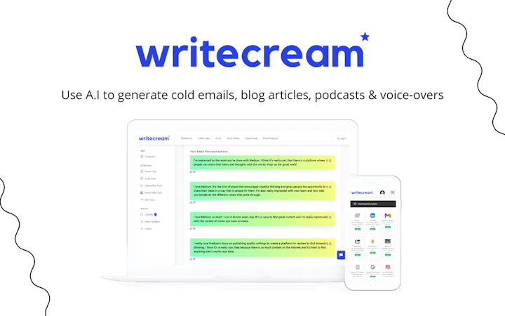 Writecream is an AI-powered marketing tool that uses advanced machine learning to write copies for Google ads, landing pages, product descriptions, blog posts, social media, and more. Users can generate personalized introductions for outbound marketing campaigns.