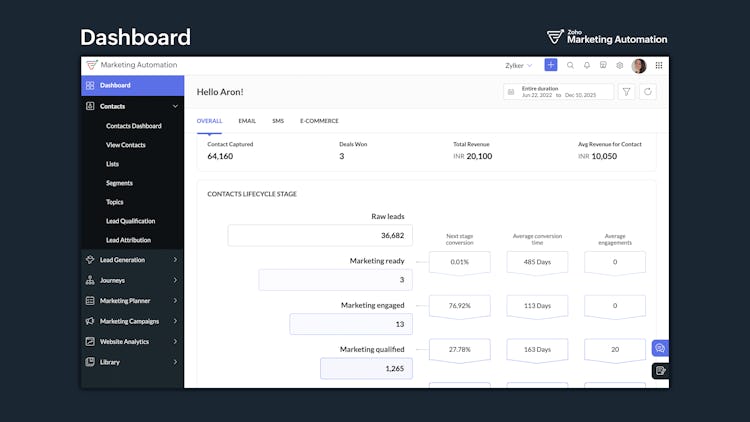 Zoho Marketing Automation helps businesses manage and automate their entire marketing journeys from lead generation to revenue. It unifies data, supports multichannel engagement across email, SMS, WhatsApp, social media, and webpages, and simplifies campaign creation with a drag-and-drop builder.