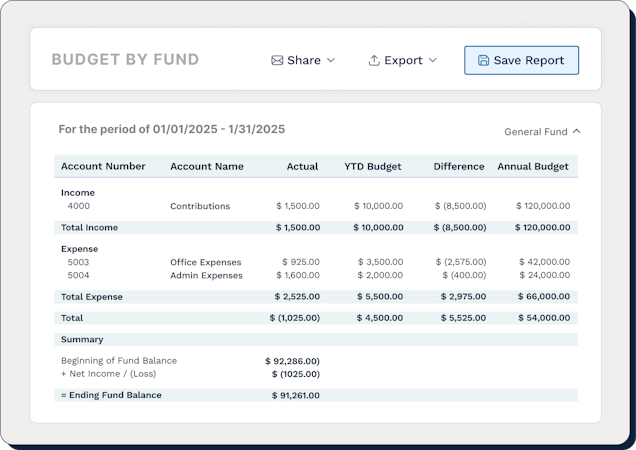 Financial reporting - Generate nonprofit reports, such as a Balance Sheet by Fund or Income Statement by Fund. It includes donation reporting, grant reporting, budgeting reports, and more.