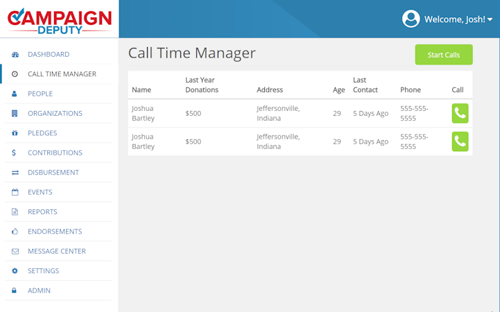 Campaign Deputy is a cloud-based donor management solution designed to help political parties and non-profit organizations manage political campaigns through online forms, donor tracking, and messaging. The call time manager sends out an automated pledge email after completing phone calls.