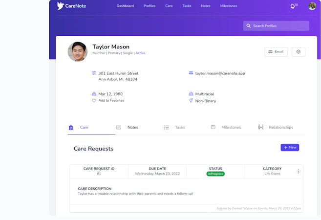 Pastoral care is a huge responsibility. CareNote believes in the potential of human relationships. It is a platform that helps care providers build those relationships every day. That's where CareNote comes in. It's an easy-to-use software that lets churches coordinate care for all of the parishioners easily and effectively, allowing them to spend more time helping those in need and less time trying to remember who needs what help and when. With CareNote, teams can manage tasks, track events, and notify members of significant changes in a streamlined workflow that gives more time for what matters most, caring for people.