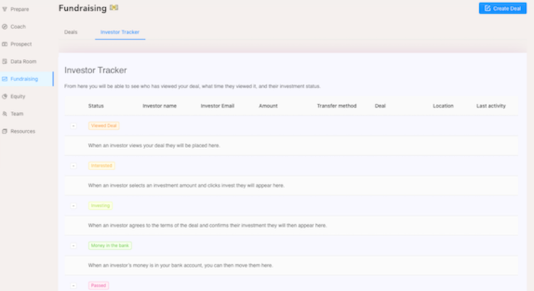 Finta is a fundraising management software that helps early stage businesses raise and organize private capital. The investor tracker tool allows employees to maintain a list of all investor applications with details, such as status, investor name, email address, amount, and preferred payment processing method, among other deal information.