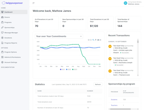 HelpYouSponsor is a cloud-based donation management platform that helps organizations by streamlining their sponsorship programs and fundraising campaigns. The solution offers a sponsorship management system that supports multi-program initiatives, from child sponsorships to community development projects. Its automated sponsor-recipient matching and customizable sponsorship levels ensure seamless coordination, while the integrated messaging system and donor self-service portal foster deeper engagement and commitment from supporters. Nonprofit leaders can also leverage the platform's financial tools including multiple payment gateway integrations, recurring donation management, and detailed reporting, to optimize their fundraising efforts and maintain financial transparency.