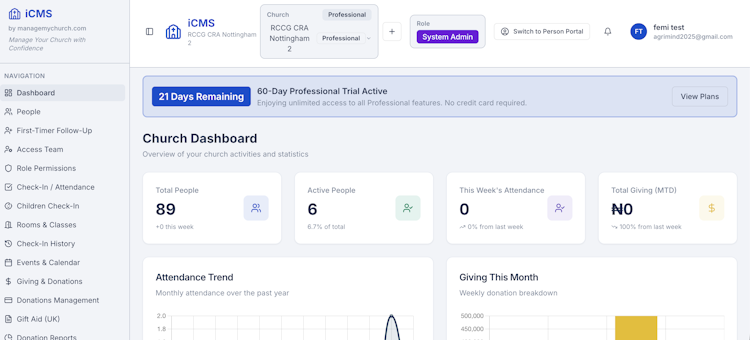 iCMS-ManageMyChurch is a comprehensive, cloud-based church management platform designed to streamline every aspect of modern church administration. Built for churches of all sizes, from small congregations to multi-campus organizations, iCMS combines powerful management tools with an intuitive interface that requires no technical expertise.