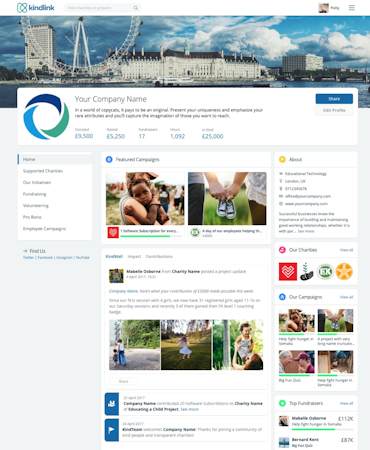 We give our clients an all-in-one technology to track their contributions, share the impact of their activities with customers, create a strong company culture of giving, and engage their employees around company values. On KindLink, companies have one place to manage: