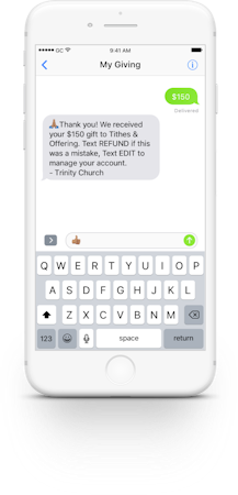 Kindrid provides a complete set of digital giving tools that make it possible to send donations to a church or nonprofit via app, SMS, or web using any device, including kiosks. When giving via SMS, the giver can simply sends a text to their church's special Giving Number, which automatically confirms their gift and gift details in a text response.