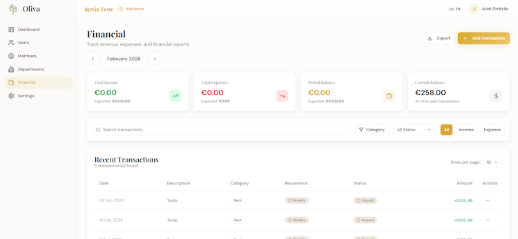Oliva is an all-in-one church management platform designed to simplify pastoral work, strengthen community engagement, and empower church growth. From member management and event scheduling to online donations, finances, and communication tools, Oliva offers everything churches need to run efficiently in one beautiful dashboard. Built with modern technology, Oliva helps pastors and ministry leaders save time, boost coordination, and focus on what truly matters—people. Whether you lead a small congregation or manage a large ministry network, Oliva adapts to your needs with intuitive tools, automation, and real-time insights.