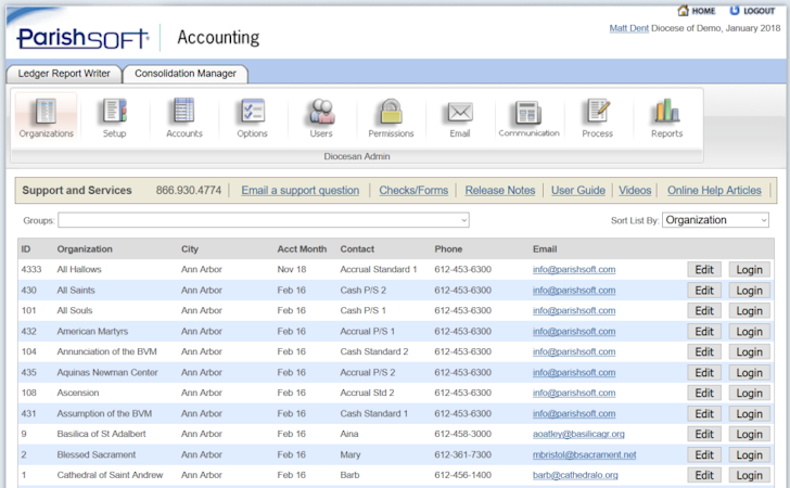 ParishSOFT's ledger report writer enables chancellors and auditors to create custom activity and financial statements. THE ParishCast communication too within ParishSOFT allows ministers to send SMS alerts about upcoming events, schedule updates, surveys, prayer requests, and volunteer sign-ups, among other activities.