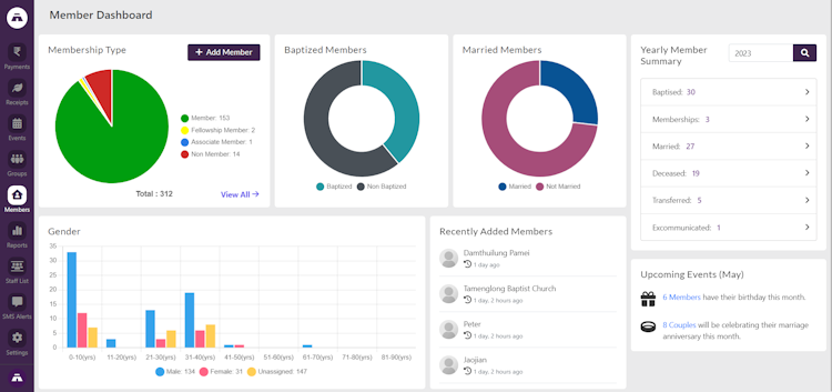 - Complete Member Profiles: Capture and store comprehensive member details, including baptism records, membership type, marriage status, family members, and personal information.