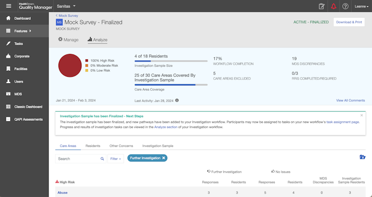 Quality Manager is a cloud-based quality management system designed specifically for skilled nursing facilities (SNFs) to maintain regulatory compliance, enhance care quality, and build community trust. The solution employs adaptable quality management tools and data-backed guidance that help facilities identify gaps, implement improvements, and prepare effectively for surveys. The system includes essential modules such as mock surveys that simulate official inspections with tailored study guides, facility assessments that automate documentation processes, a QAPI plan builder that ensures alignment with CMS standards, and action indicators that pinpoint at-risk areas requiring attention.