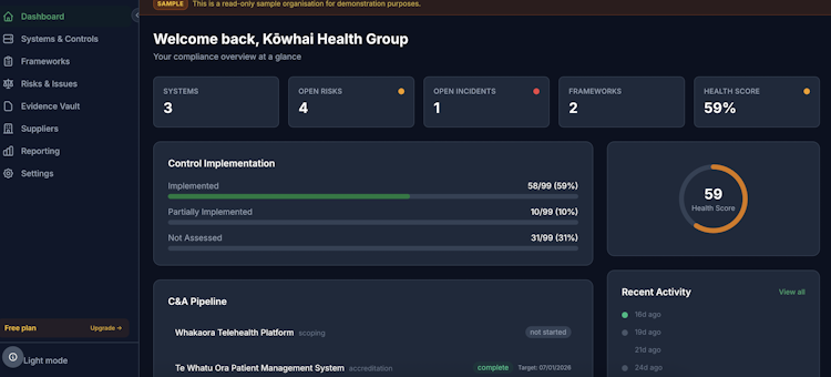 Additional modules support supplier risk assessment, waiver and exception management, role-based access control and audit logging with exportable records. A built-in AI assistant offers context-specific guidance on NZISM controls and ticket creation for support. The platform maps controls across frameworks to prevent duplicated work and maintains archived records from prior accreditation cycles for audit purposes. A global identity model enables consultants and assessors to manage multiple client engagements within a single account while preserving data isolation. Authentication options include passwordless magic links with optional time-based one-time-password multi-factor verification.