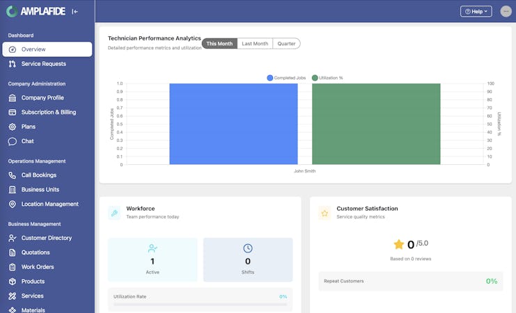Amplafide offers reputation management tools that automatically request customer reviews to build online presence on platforms like Google and Yelp, alongside detailed reporting and analytics that track key performance indicators, technician performance, job profitability, and marketing return on investment through comprehensive dashboards. The software integrates with essential third-party services including QuickBooks for streamlined accounting and financial management, Stripe for secure payment processing, and Google Calendar for synchronized scheduling. These integrations allow for automated data flow between systems, reducing duplicate entry and ensuring consistency across business tools. The system is built with responsive design principles, functioning across desktop, tablet, and mobile devices to provide field teams with full access to business management tools regardless of location.