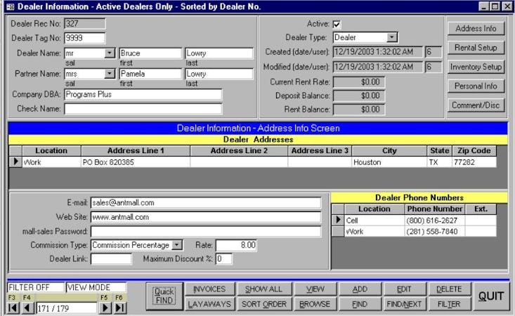 Antique Mall Accounting System allows store owners to deduct rent, credit card fees, commissions, advertising, and other charges from dealers’ settlement checks. Administrators can also maintain custom mailing lists for future reference and generate and share settlement reports on a weekly or monthly basis with dealers.