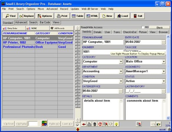 Asset Organizer Pro is a flexible, robust, and easy-to-use asset management software designed to help professionals manage all their company's fixed assets. A versatile database solution, Asset Organizer Pro gives users an easy way to catalog, manage, and track all their assets data. Users can quickly access their assets and inventory data.