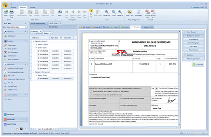 Blue EYE - designed for CAMO management, this module enables you to keep track of the maintenance status of your fleet (including scheduled and unscheduled maintenance, AD, SB), send work orders to maintenance centres and compile all history of parts, repairs, findings and related dirty fingerprints in one unique environment.