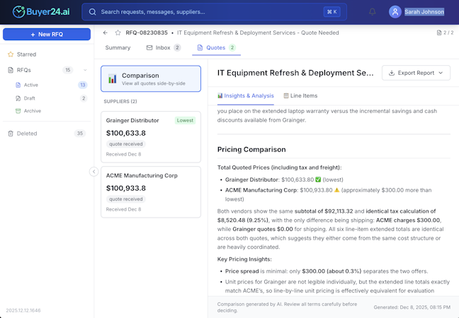 Buyer24.ai is an AI-enabled procurement automation platform that streamlines the request for quote process by unifying supplier communication, parsing documents and building comparable quotes. The platform targets procurement professionals in fast moving catalog procurement sectors such as maintenance, repair and operations procurement, electronics distribution, e commerce, repair and refurbishment shops, value added resellers, managed service providers and system integrators. Buyer24.ai addresses the challenges of managing requests for quotes across multiple suppliers by eliminating inefficiencies, communication delays, fragmented information and processing bottlenecks.