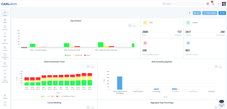 CAREweb also provides executive leadership with real-time visibility into the organization’s risk and compliance posture through advanced dashboards, analytics, and reporting capabilities. Senior management and board-level stakeholders can monitor key risk indicators, control effectiveness, audit findings, and regulatory compliance status across the enterprise, enabling informed decision-making and stronger governance oversight.