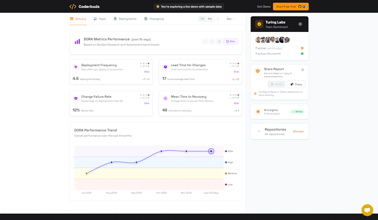 Coderbuds is a cloud-based and AI-enabled analysis tool designed for engineering managers and CTOs that offers visibility into team performance. The tool assists with tracking DORA metrics and automatically analyzes team's GitHub activity to provide instant insights into deployment frequency, lead times, and delivery bottlenecks.