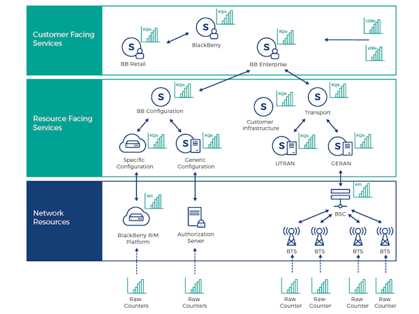 The system defines service models that monitor interdependencies between customer services and the network infrastructure. This holistic view facilitates efficient monitoring of new digital services enabled by 5G and IoT technologies. Built-in machine learning algorithms enable predictive maintenance through automatic baselining and anomaly detection. SQM also integrates with intelligent event processing systems by providing threshold-crossing event data to enable end-to-end processing of events from multiple sources.