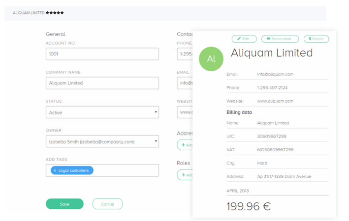 Composity’s CRM module allows users to manage relationships with potential and converted clients throughout the entirety of the sales process. Full client histories, detailed profiles, and custom account data enable the collection and recording of all relevant information, and multichannel communication capabilities cover chat, email, phone calls, web forms and support enquiries. The CRM also provides features for managing marketing campaigns, customer segmentation, events, projects and tasks, quotes, invoicing, and payments.