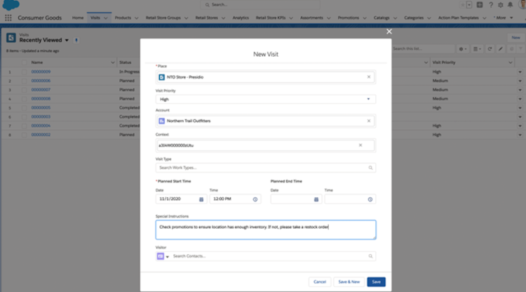 Consumer Goods Cloud is a customer relationship management (CRM) software that helps businesses manage operations related to workflow approval, visit planning, lead tracking, and more on a centralized platform. It enables staff members to create store visit schedules with details, such as place, visit type, priority, special instructions, and task lists.