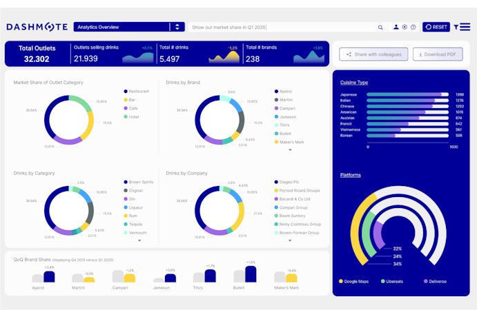 Dashmote is an artificial intelligence (AI)-enabled platform designed to help businesses monitor consumer brands in the market. With the use of AI, consumer brands can be identified through images on internet platforms, such as Google Maps. Other information can be obtained from blogs, e-commerce platforms, and webshops. Using advanced analytics, all collected data is filtered and organized and results are presented on dashboards.