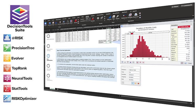 DecisionTools Suite facilitates integration with Microsoft Excel. It also offers tools such as TopRank that enable users to perform automated what-if sensitivity analysis and RISKOptimimzer that helps with risk optimization under uncertainty.