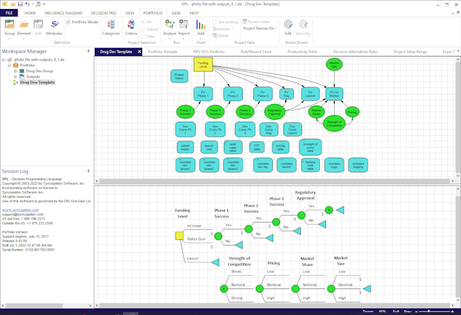 DPL Portfolio's modeling environment is based on a decision analysis tool. It leverages DPL's intuitive graphical Influence Diagram/Decision Tree modeling interface for developing decision models. With the non-portfolio versions of DPL, the focus is most often on analyzing one or more decisions for a single project, asset or business situation. With DPL Portfolio, the focus shifts to analyzing decisions both at the project/asset-level and at the portfolio-level for a set of projects or assets within a portfolio.