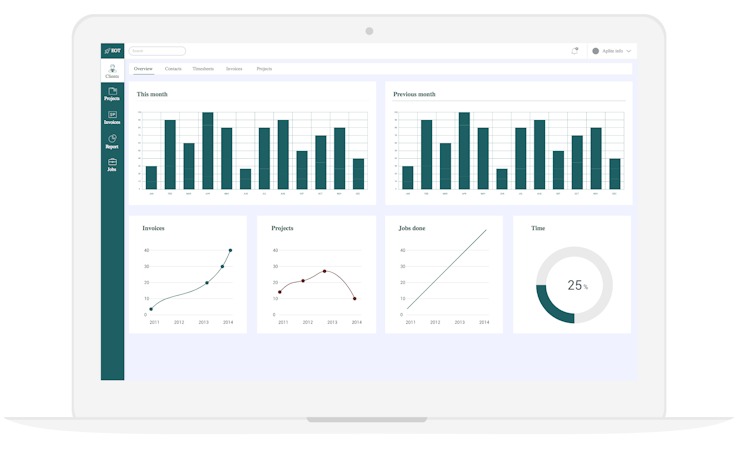 • View active and completed jobs via the dashboard, as well as invoices based on the hours worked.