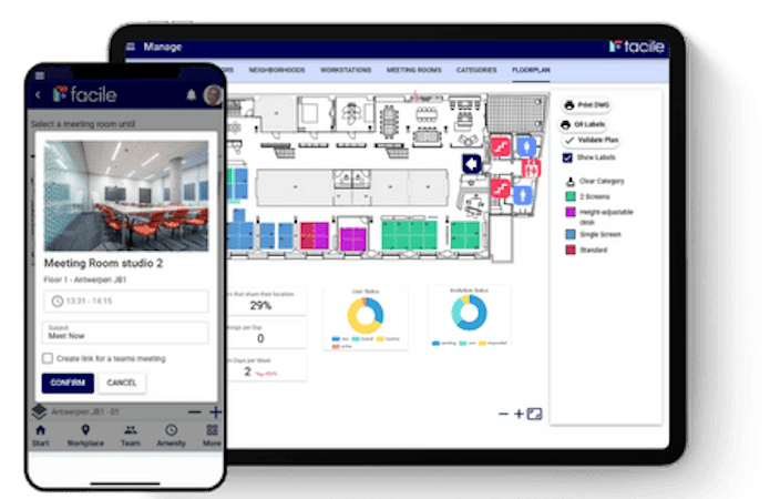 Facile connects employee convenience with operational control. Employees can plan on site days clearly, reserve desks, meeting spaces and amenities quickly, and see where colleagues are working to coordinate in person time with intention. Adoption is simplified through a Progressive Web App approach that reduces friction and keeps the system up to date without app store installs.