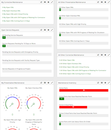 personnel, parts, preventative maintenance (PM), service requests and corrective maintenance (CM). Monitor your own CMs/PMs, other CMs/PMs and maintenance inventory from the dashboard and monitor your team’s effectiveness and achieve your goals using Key Performance Indicators (KPIs).