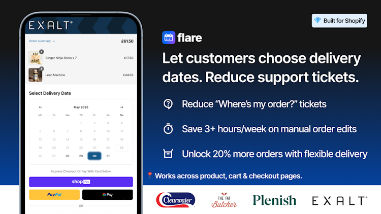 Flare is a delivery date picker and checkout automation application built for Shopify and Shopify Plus merchants. The software enables customers to select delivery or pickup dates during the checkout process while providing merchants with comprehensive control over shipping rules, rate automation, and fulfillment workflows. It serves merchants across industries such as furniture, perishable foods, beverages and subscription services, gifting, and live goods. The platform is deployed by over seven hundred Shopify brands handling significant order volumes of time-sensitive or high-consideration products.