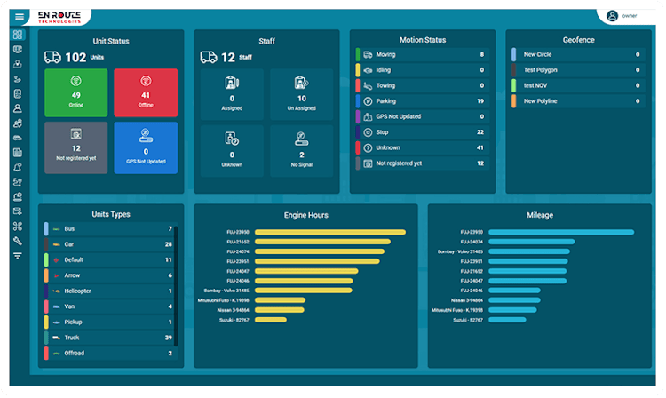 The system incorporates GPS tracking for live location monitoring, motion status verification, and complete trip history documentation, including trip duration, start and end location data. A data analytics dashboard generates customized reports and insights for strategic planning. Scheduled report delivery and accessible historical data logs support in depth operational analysis. Driver identification, alarm systems, eco driving monitoring, geo fencing, and remote command execution enhance vehicle and driver security. Fleet maintenance management compiles service requirements and issues automated reminders to facilitate preventive maintenance. Integrated sensors track equipment status and environmental parameters. Event notification configuration enables automated alerts across multiple communication channels. Remote monitoring is possible via web based dashboards and mobile applications. Route optimization features and fuel management tools monitor consumption, idling time, and detect potential leaks.
