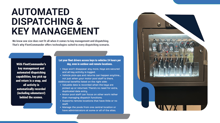 Helping organizations with large fleets including Government, Universities, Utilities, Social Services, Healthcare & more, FleetCommander reduces costs, saves time, & improves service through automated fleet management. Clients achieve cost reductions of 15%+ through vehicle fleet right-sizing, achieving verifiable ROI. Manage all vehicles and driver profiles online. Start an automated motorpool or automate the one you already have. The system also offers; secure key control GPS; and fuel-management & risk-management. Arrange a demo now to learn more.