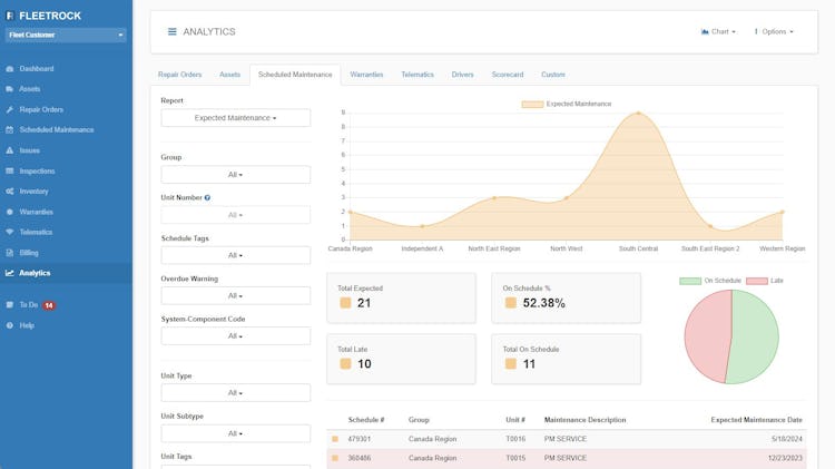 Fleetrock encompasses three primary solution categories including managed maintenance, fleet management, and shop management. The managed maintenance suite provides asset management for tracking vehicle inventory and equipment details and scheduled maintenance tools for planning and executing preventive maintenance programs. Warranty management functionality monitors coverage periods and supports claim processing. An issue tracking module captures vehicle problems and manages them from initial identification through resolution. Inspection management assists with creation, assignment, and completion of formal inspection protocols. Telematics connection features integrate with vehicle systems for real-time data collection.
