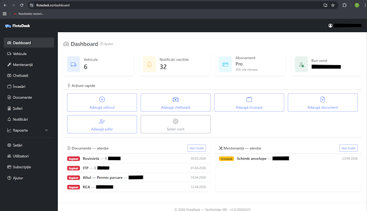 FlotaDesk is a cloud-based fleet management software platform that centralizes vehicle administration, documentation, maintenance scheduling and financial tracking for automotive fleets. The platform delivers a comprehensive digital workspace for monitoring vehicle status, administrative documents, expenses, revenue and automated alerts through a unified dashboard accessible from any device. Developed by TechSolidar SRL in Craiova, Romania, FlotaDesk provides localized functionality for managing compliance documents required in the Romanian market, including periodic technical inspections, civil liability insurance, comprehensive vehicle insurance and road toll vignettes. The objective design removes operational silos and presents all fleet information in a single interface.