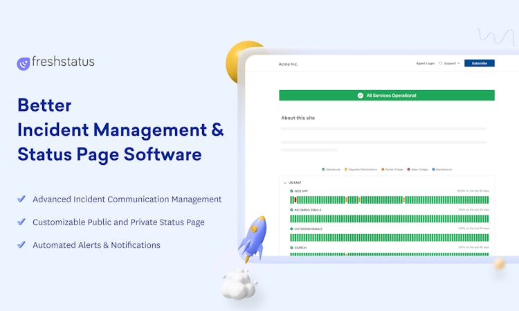 • Freshstatus tracks all service availability, incident, and maintenance metrics, providing users with insight into incident frequency, mean resolution time, and which services are impacted most often.