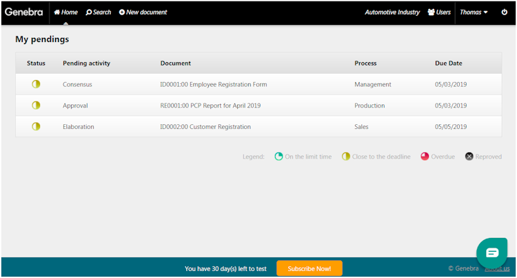 With Genebra, master document lists are automated, removing the need for users to manually manage expiration dates, people in charge, and other information. All team members are automatically provided with the most recent versions of each document, while previous versions are stored and maintained. Automatic notifications alert users responsible for document drafting, review, and final approval through calendar events and emails. If failure occurs at the consensus stage, documents are returned to the user who drafted them. Publication is automatic once documents once approved, and all stakeholders are notified via email.