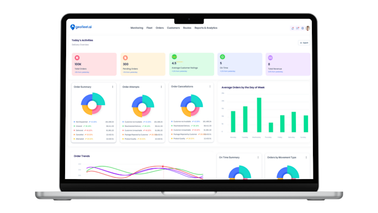 Geofleet.ai enhances delivery management through a multi-faceted approach that includes automated order assignment, real-time order tracking with accurate ETAs, contactless delivery options with proof of delivery capture, and customer notifications across multiple channels. The system provides dispatchers with tools for optimizing route planning and delivery assignments through an intuitive web application that enables workflow management and delivery KPI tracking. Performance analytics and driver behavior monitoring capabilities allow organizations to identify improvement opportunities and maintain high service levels.