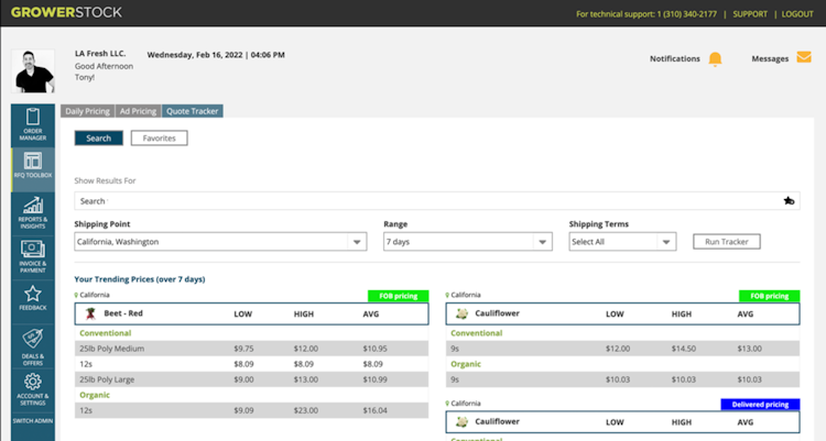 Growerstock is a produce industry procurement engine that allows buyers to locate and procure the best products at the best price in seconds. The platform includes an order engine, with pricing data built in, order management tools and organized communication for faster and more secure transactions. Growerstock's produce RFQ (request for quote) enables buyers to easily manage supplier daily quotes and request Ad pricing with just a click. 'Price Intelligence' is an industry first where reliable pricing data helps buyers make smart decisions in the spot market. AI-driven insights improve decision making and increase profitability.
