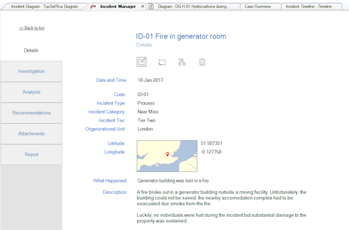 The analysis starts with a timeline that inventories and categorizes all of the events and people involved. The Incident Manager then leads users step by step through the analysis process to create a diagram. Users can also build their own diagram visualizations.