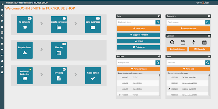The software manages every aspect of the shop circle: suppliers discounts, items, quotations & sales, standard and special purchase orders, advanced payments, warehouse(s), showroom planning and deliveries, invoicing and after sales support.