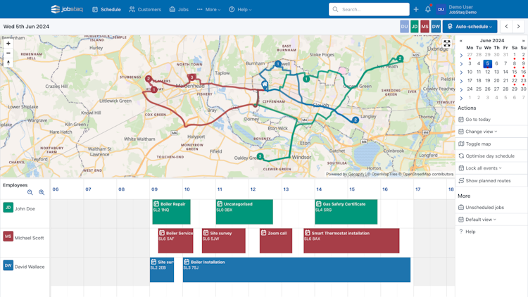 Visual drag-and-drop calendar shows all engineers and jobs at a glance. The system suggests optimal job placement considering travel time, engineer skills, and customer preferences. Map view helps plan efficient routes and reduce fuel costs.
