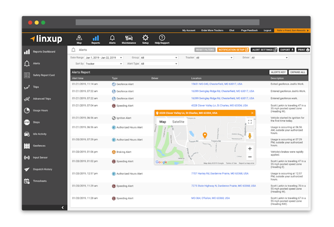 Linxup customers can view real time tracking of all vehicles and assets via desktop or on a mobile iOS or Android device. The intuitive software also provides robust features such as configurable geofencing, route tracking/route replay, driver scorecards, customer address book with pre- and post-visit recap, engine on/off monitoring, maintenance tracking, DTC problem codes, and vehicle maintenance monitoring and reminders. In addition, Linxup dashcams provide road and driver monitoring to reduce risk, limit liability, and insurance costs. The IFTA fuel-tax reports add-on allow users to view fuel gallons used, state tax rates, and more.