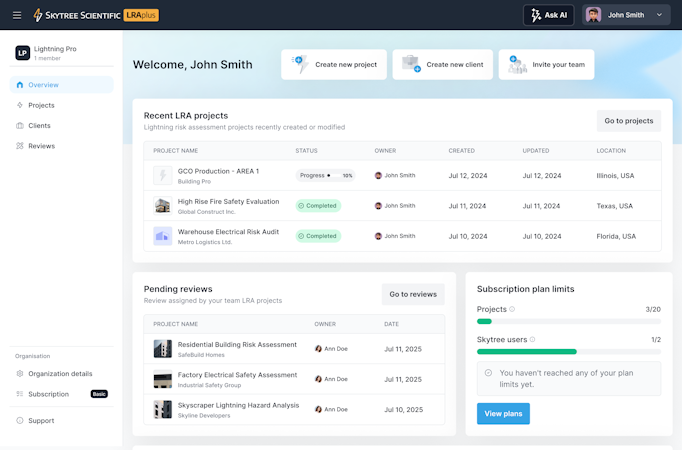 The platform aligns with international standards such as IEC six two three zero five and NFPA seven eight zero standards and integrates current flash and strike point density data. Users may access optional integrated strike reports with map integration for enhanced risk visualization. The system supports multi structure projects by enabling assessments of multiple buildings or assets within a single project framework. Technical features include Computer Aided Design file import, graphical calculation tools, automated project intake forms and artificial intelligence powered lightning protection recommendations that reduce human error.