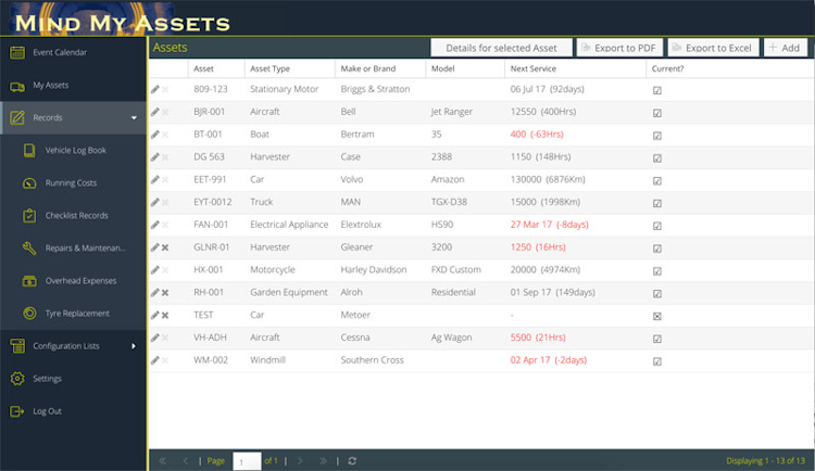 Mind My Assets is a web-based software that helps businesses maintain asset records and track maintenance requirements for available equipment, such as vehicles, motors, pumps, and electrical appliances. The online database allows employees to store asset-related information, including oil usage, capacity, horsepower, engine number, registration details, insurance documents, and depreciation values.