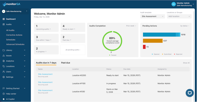 Whether you're managing compliance across 5 locations or 500, monitorQA ensures every audit is executed the same way, every time with clear ownership, airtight records, and zero findings falling through the cracks. Corrective actions are assigned, tracked, and resolved (not just logged), so your team spends less time chasing paperwork and more time fixing real issues.