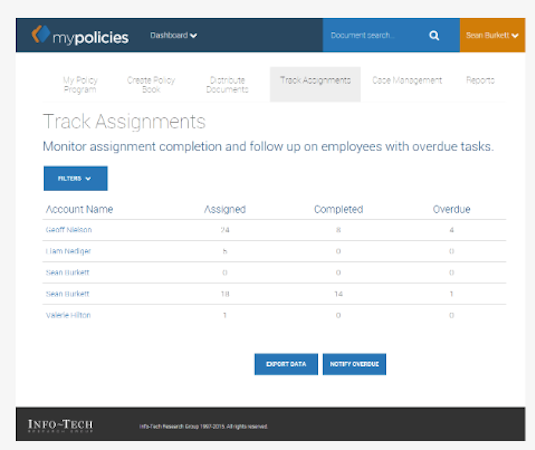 myPolicies is an online policy management software designed to streamline the creation, approval, distribution and monitoring of corporate policies, procedures, and forms with features such as best practice policy templates, a central repository system, document tracking, one-click reporting, and more. As an online solution, myPolicies gives users the flexibility to manage policies and procedures anytime, anywhere, via any internet-enabled device.