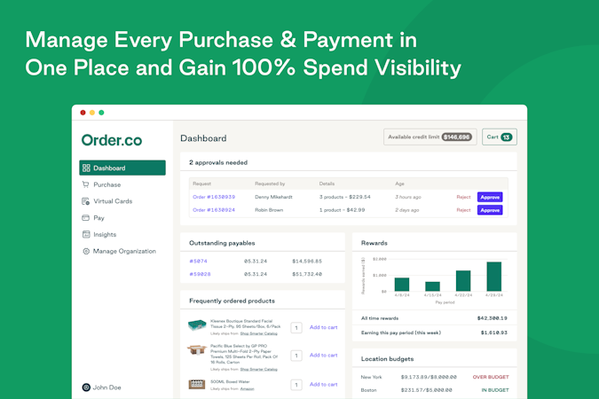 Modernize your procurement process with Order.co – an easy-to-use procurement software that simplifies every aspect of purchasing for your business. With Order.co you can automate sourcing, purchase requisitions, and PO management while improving spend analytics - all in one customizable platform. Leverage Order.co’s AI powered sourcing technology and exclusive supplier discounts to save an average of 5% on products, and avoid supply chain disruptions with Order.co’s 17K+ vendor network. Customize budget and approval workflows for your business, purchase from your custom product catalog, and pay on flexible terms with your preferred method. Access real-time spend data and insights by user, location, cost center, or vendor for enhanced budgeting, forecasting, and reporting. Order.co works seamlessly alongside any ERP and accounting system, including direct integrations with Quickbooks Online, Sage Intacct, Netsuite, and more to simplify your entire purchase-to-pay process.